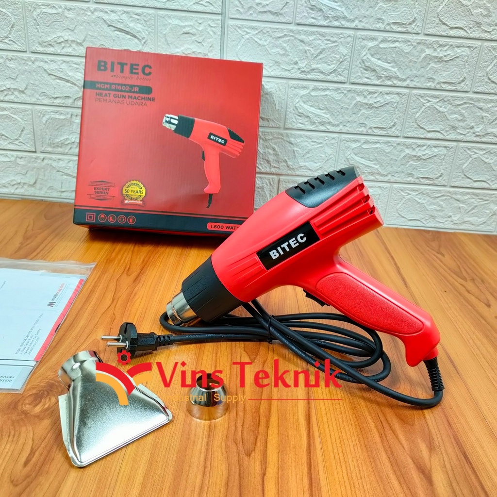 Bitec HGM R1602 JR adalah pemanas udara yang biasa digunakan untuk meng seal plastik, memasang kaca film, dan sebagainya. Kelebihan dari alat ini adalah wattnya yang cenderung lebih kecil dibanding dengan merek lain yang biasa mengkonsumsi 1600 - 2000 Watt. Alat ini juga memiliki 2 pengaturan speed flow angkn serta memiliki 2 nozzle yang dapat melebar dan fokus.SpesifikasiModel HGM R1602Input power 1600 WAir flow 1 Speed 280 L/minAir Flow 2 Speed 480 L/minAir temperature 300/500 CVoltage/Freq 220 V / 60 HzPacking 1 unit / boxPerlengkapan1 unit Bitec heatgun HGM R16021 pc nozzle lebar1 pc nozzle fokus1 pc buku manual1 pc buku garansiPacking kardusGaransi Resmi 1