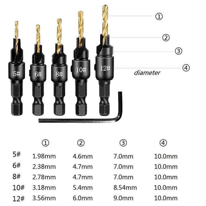 barang oke dan terbaik5pcs Mata bor countersink + 1pc kunci LDigunakan sebagai pilot hole untuk menyamarkan sekrup/baut (menanam sekrup/baut) pada pengerjaan media kayu anda, sehingga obyek pekerjaan anda menjadi rapi.Mata bor bisa di ganti dan di setting kedalamannyaAs model hex, bisa digunakan pd mesin bor cordless5Pcs HSS Countersink Drill Bit Set Pilot Hole Woodworking Chamfer With WrenchMaterial : High speed steel 4241Length : Approx. 5.8cm/ 6.2cm/ 6cm/ 6.4cm/ 6.7cm (2.28"/ 2.44"/ 2.36"/ 2.52"/ 2.64")Wrench Length : Approx. 5cm/ 1.97"- Special designed steel counter sleeve countersinks or counter bores pilot hole.- Adjustable counter sleeve depth with a wrench.- Drill and countersink for wood screws without changing bits.- Countersink or counter bore clean, smooth holes for screws and fasteners.- For use in wood and plastic. Package Included:1 x 5# 1.98mm Chamfer Drill1 x 6# 2.38mm Chamfer Drill1 x 8# 2.78mm Chamfer Drill1 x 10# 3.175mm Chamfer Drill1 x 12# 3.56mm Chamfer Drill1 x W
