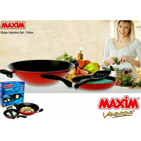 WAJAN MAXIM VALENTINO SET :- 1 Set terdiri dari 2 peralatan masak ( Wok 30 cm + Frypan 22 cm )- Dilengkapi spatula plastik dan sponge- Material lebih kokoh dan dilapisi anti lengket ( Teflon Classic )- Model lebih dinamis- Mudah digunakan dan dibersihkan- Sangat cocok untuk digunakan sendiri / Arisan / Hadiah ( Doorprize )Mampu membuat gorengan apapun dan membuat anda menjadi cepat untuk menggoreng makanan. Dengan handlenya yang nyaman dipegang membuat anda lebih mudah dalam memasak.Dilapisi dengan DuPont nonstick coating yang terbuat dari polymer Teflon yang sudah tersertifikasi FOOD GRADE dan SANGAT AMAN untuk keperluan masak-memasak sehari-hari.DuPont non-stick coating frypan sudah teruji secara global dan lulus dari berbagai Quality Standard dunia selama 30 tahun lebih dan digunakan di berbagai restoran ternama dan chef-chef terkenal di seluruh dunia.Tidak seperti bahan-bahan teflon konvensional lainnya, DuPont non-stick coating ini dilengkapi dengan 3 lapisan utama, yaitu :1. Top-coating : memudahkan anda untuk mengangkat makanan dengan mudah tanpa ada lengket dan sangat mudah untuk dibersihkan2. Mid-coating : lapisan kedua ini memberikan ketahanan yang luar biasa dari abrasi / goresan dari alat-alat rumah tangga anda lainnya seperti bahan-bahan yang terbuat dari besi, kawat pencuci, kayu, dan bahan2 lainnya3. Primer-coating : lapisan terbawah yang memberikan perlindungan ekstra terhadap suhu yang tinggi dan benturan dengan benda-benda lai
