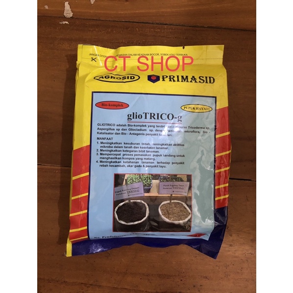 Trico-G adalah bio komplek yang terdiri dari campuran jamur tricoderma sp, dan gliocladium sp, dengan tambahan formulasi spesifik dari 8 bio-katalisator dan bio-antagonis penyakit tanaman dari hasil penelitian bio teknologi terbaru.Manfaat Trico-G : 1. mencegah penyakit rebah kecambah2. meningkatkan ketegaran bibit3. mencegah serangan penyakit layu4. mempercepat pemasakan pupuk kandang5. meningkatkan kesuburan tanahTrico-G dapat di aplikasikan di semua tanaman.isi bersih : 50