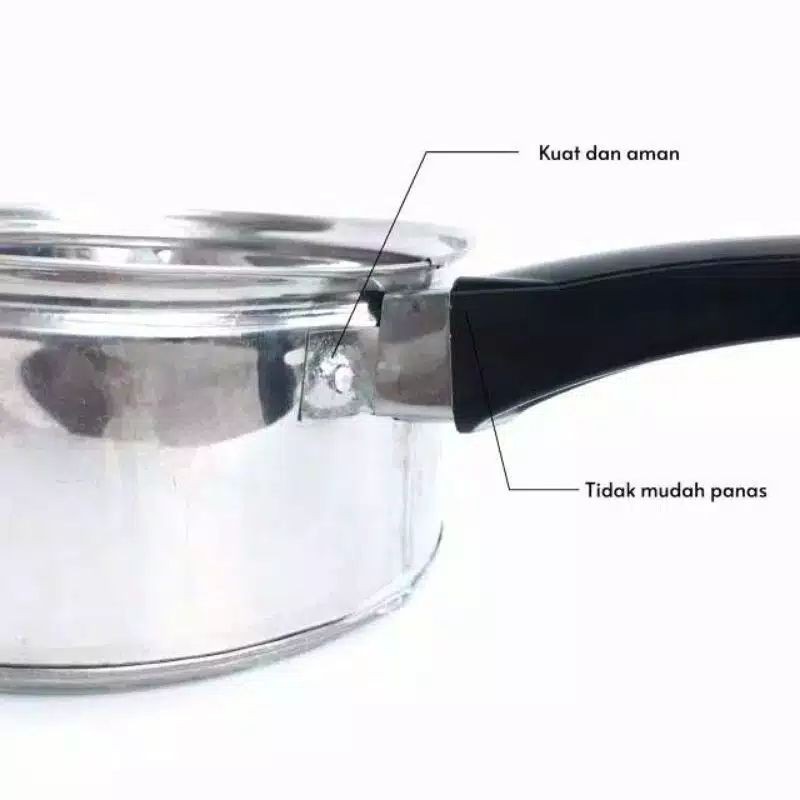 Panci susu stainless Bahan stainless tebal 0,3 berkualitas mengkilap dan tidak berkaratHandle plastik yg tahan panas Tinggi panci 9,5 cm, diameter 16 cmCocok Untuk Souvenir :> HAJI> Khitanan> Pernikahan