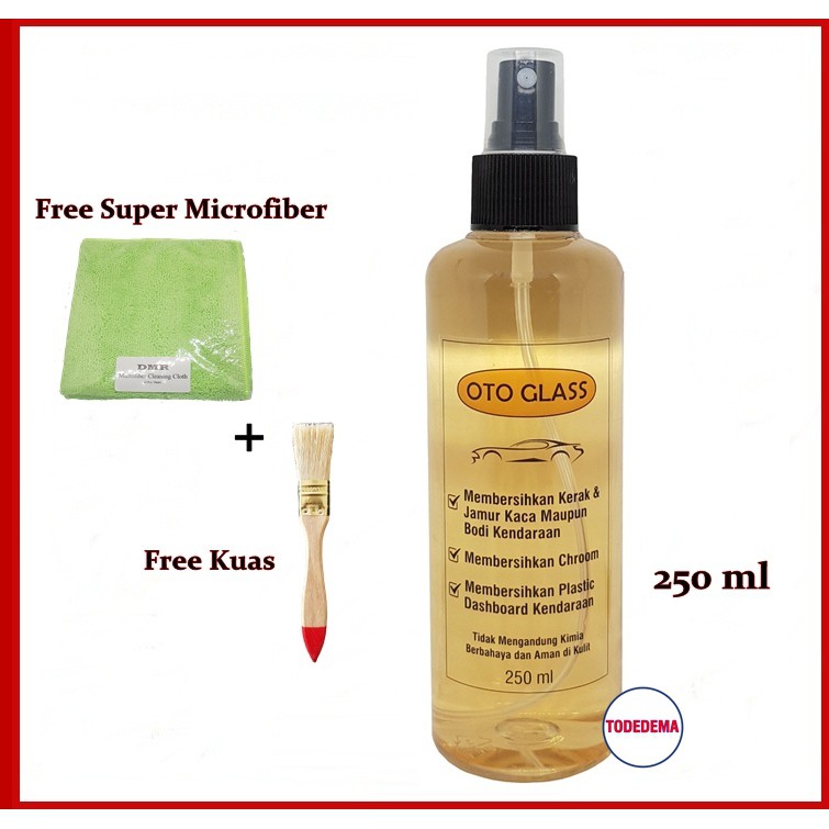 Oto Glass Waterspot Remover Obat Pembersih Penghilang Jamur Kaca Kerak Body MobilIsi bersih : 250 mlDeskripsi : Digunakan untuk menghilangkan jamur kaca mobil, jamur pada body mobil, kerak pada body mobil dan emblem/logo mobil juga membersihkan chrome.Bonus : - 1 Kuas + 1 Super Microfiber Kain Lap Ajaib. - Bubble wrap dan kardus packing.Fungsi Oto Glass :- Membersihkan jamur, hard water / kerak air dan mineral deposit- Dapat digunakan pada body dan kaca kendaraan- Membersihkan kerak pada logo / emblem kendaraanCara penggunaan :1. Bersihkan debu dari kaca atau body mobil2. Semprotkan Oto Glass pada area kaca yang berjamur atau body yang berkerak3. Bersihkan jamur / kerak pada area yang sudah di semprot dengan Oto Glass tersebut dengan menggunakan kuas atau microfiber.4. Jika jamur / kerak membandel, lakukan ulang tahap (3) diatas 5. Bilas seluruh bagian menggunakan air hingga benar-benar bersih dan merata6. Lap dengan Microfiber hingga ker