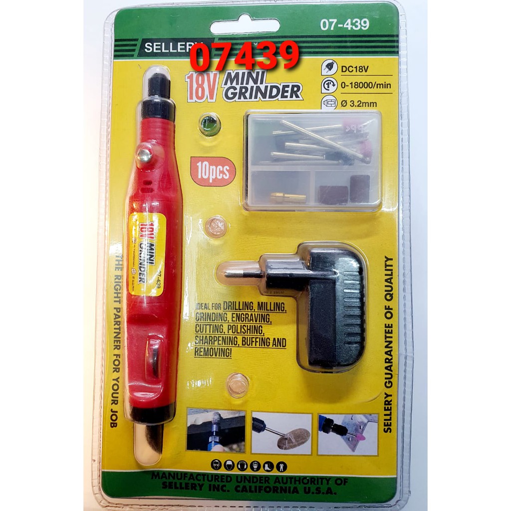 Mini Grinder 18 Volt Sellery 07-439Mini grinder bisa juga sebagai mini drill (untuk bor pcb atau memoles batu akik,dll). Di lengkapi putaran ON & OFFInput:18V DC (sudah termasuk adaptor)Speed bisa di atur/adjustable:3.000 s/d 18.000rpmTombol (dekat mata drill) : berfungsi untuk membuka/ganti mata borFeatures :-Electric drill variable:3.00 s/d 18.00 RPM -18V adaptor (sudah termasuk adaptor)-Double bearing design-double insulated-easy to use in any position-accepts all rotary toll accessories-light weight design for precision peration-ampelas-engarving bit-drilling:diameter 0.3mm & 3.2mm (max)-dimension :160mmx24mm dia